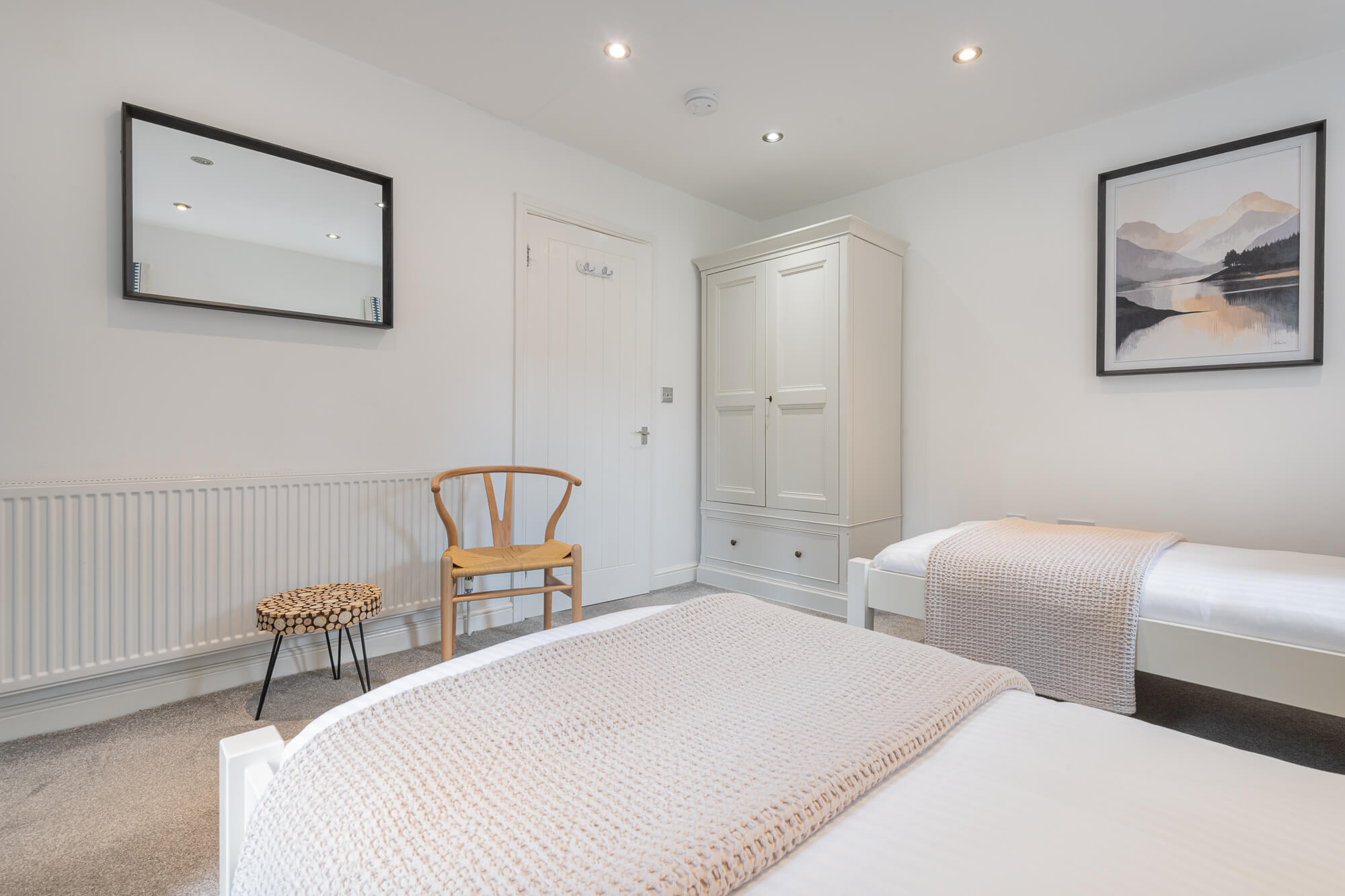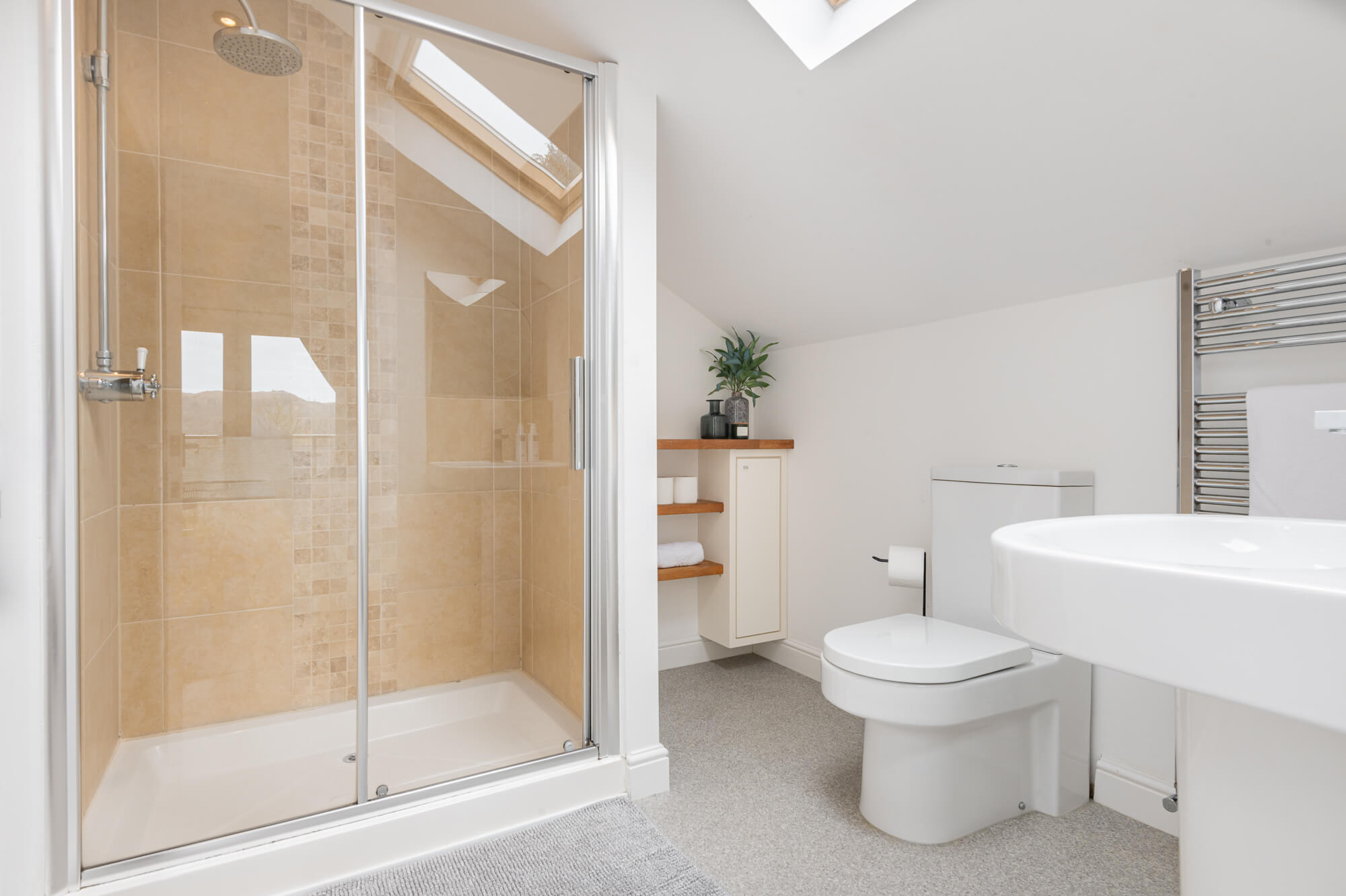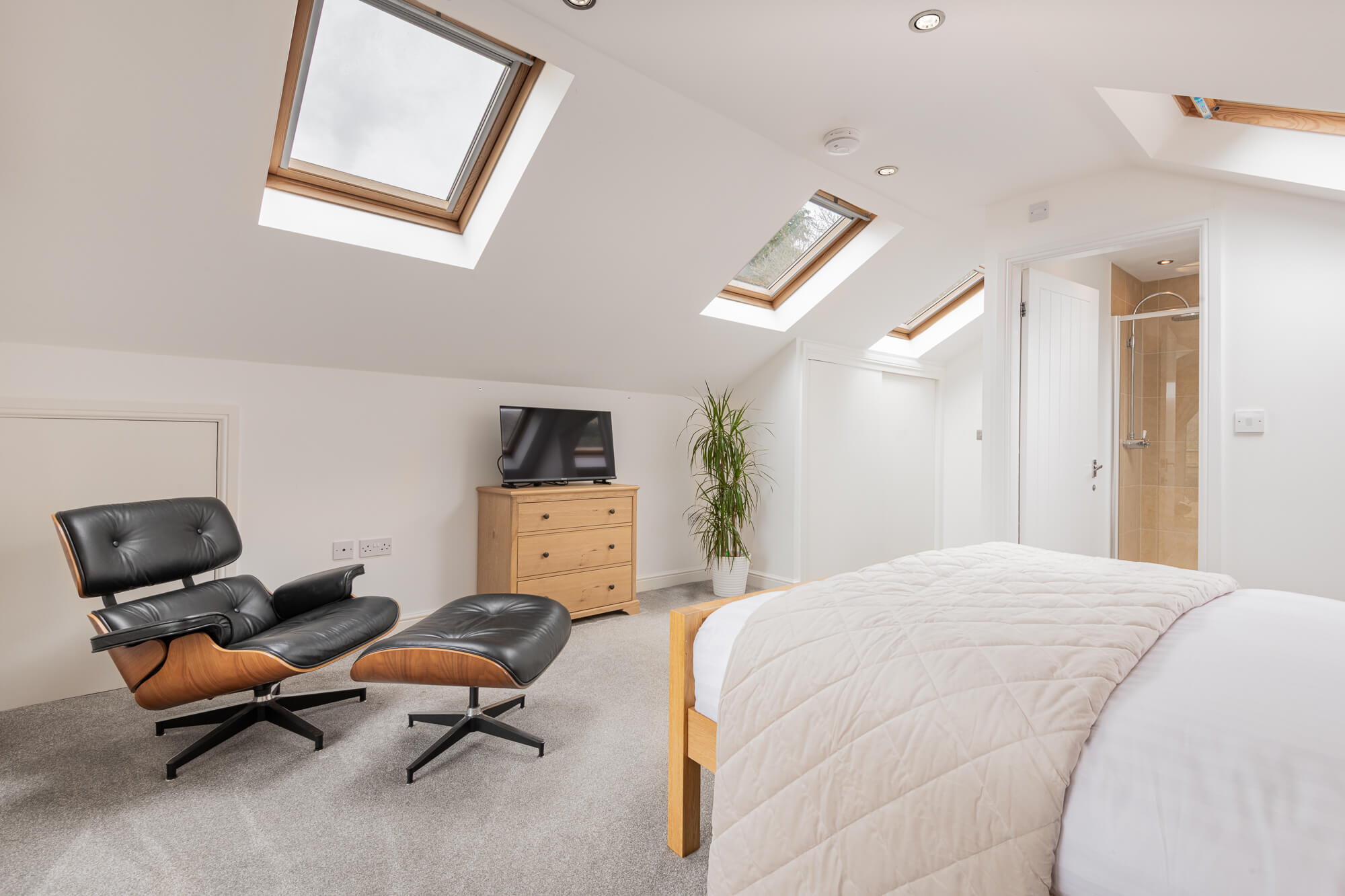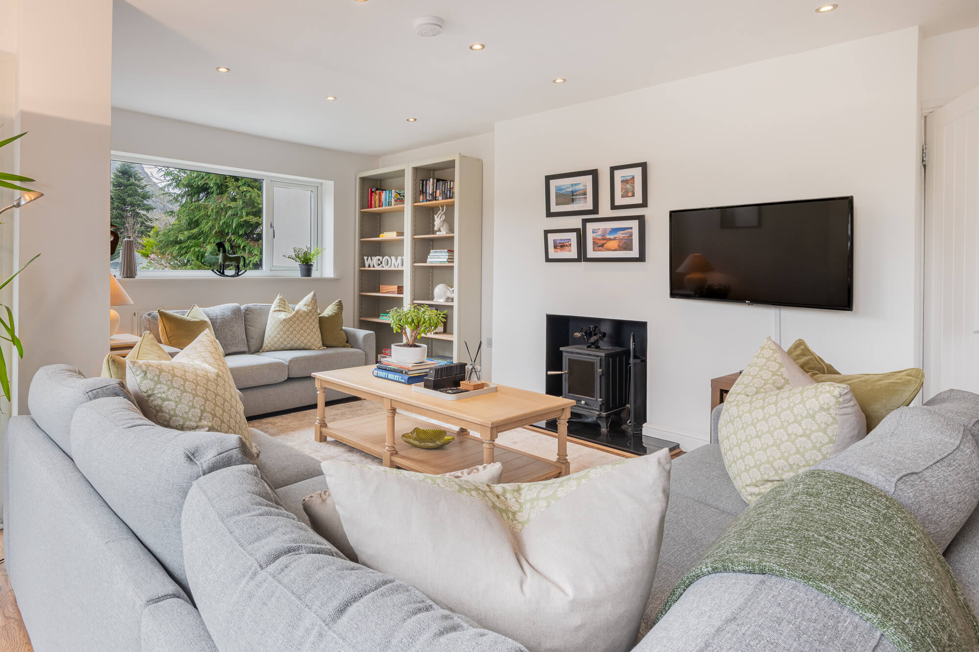 Two separate seating areas allow the house to unfold around you—one centred around the warmth of the woodburner, the other ideal for quieter moments, conversation or settling in to watch a film. A well-appointed family bathroom, alongside the en-suites, ensures everything works comfortably for larger groups.