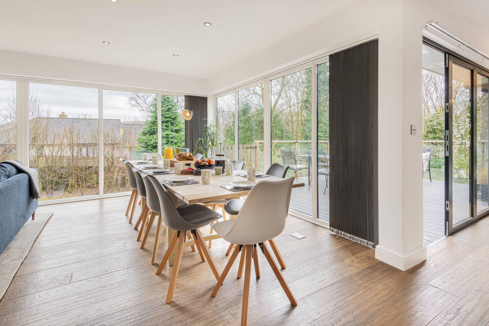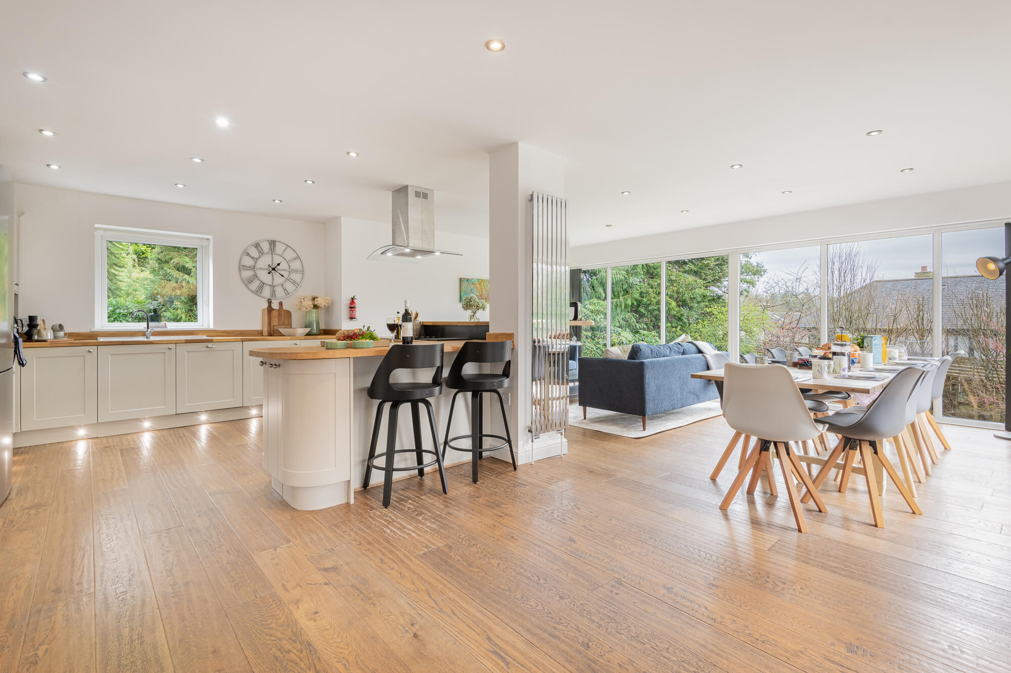 At the heart of the home, a well-equipped kitchen and dining area brings everyone together. Designed for both ease and sociability, it works just as well for relaxed breakfasts as it does for longer, shared meals. The large dining table comfortably seats eleven, creating a natural focal point for time spent together.