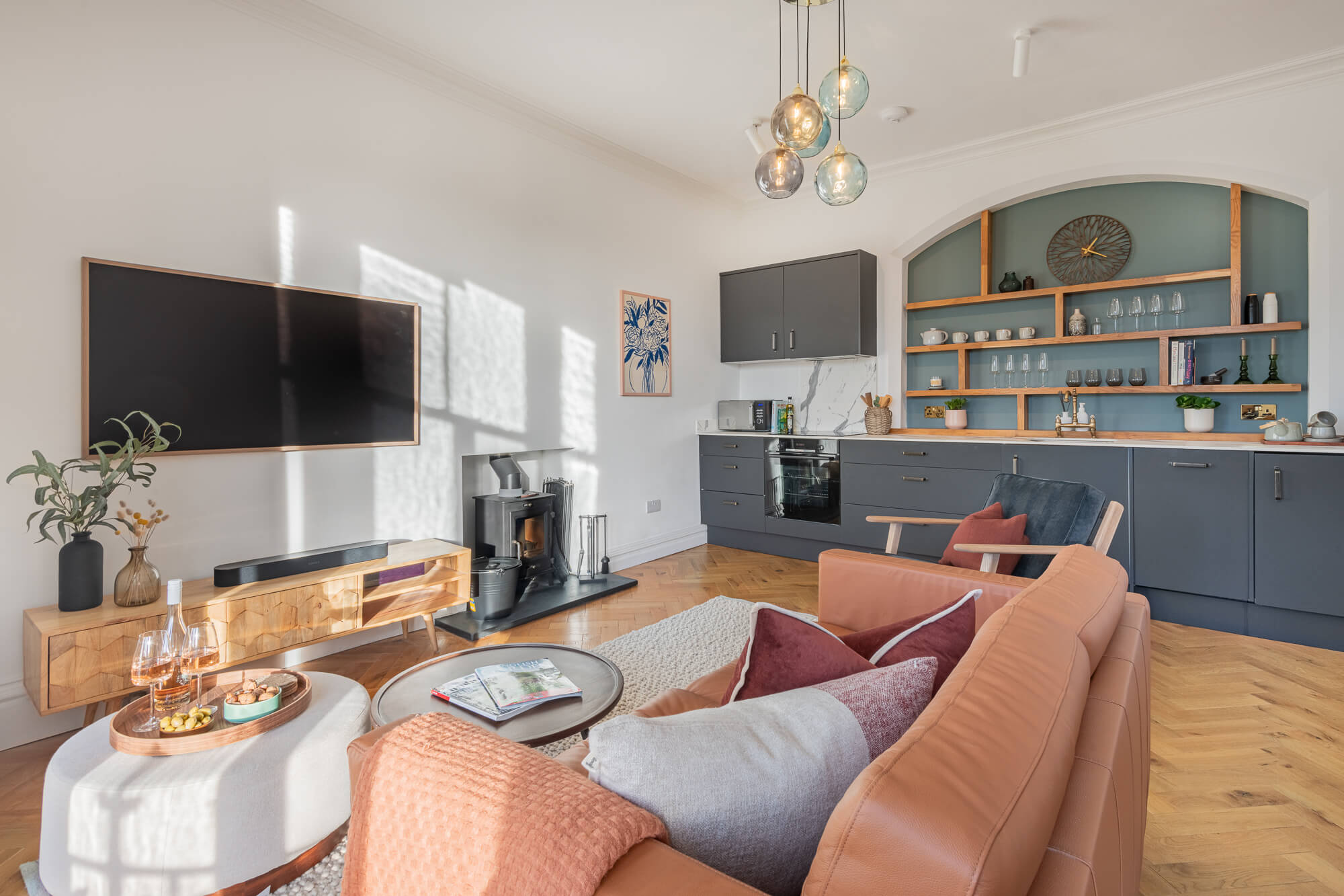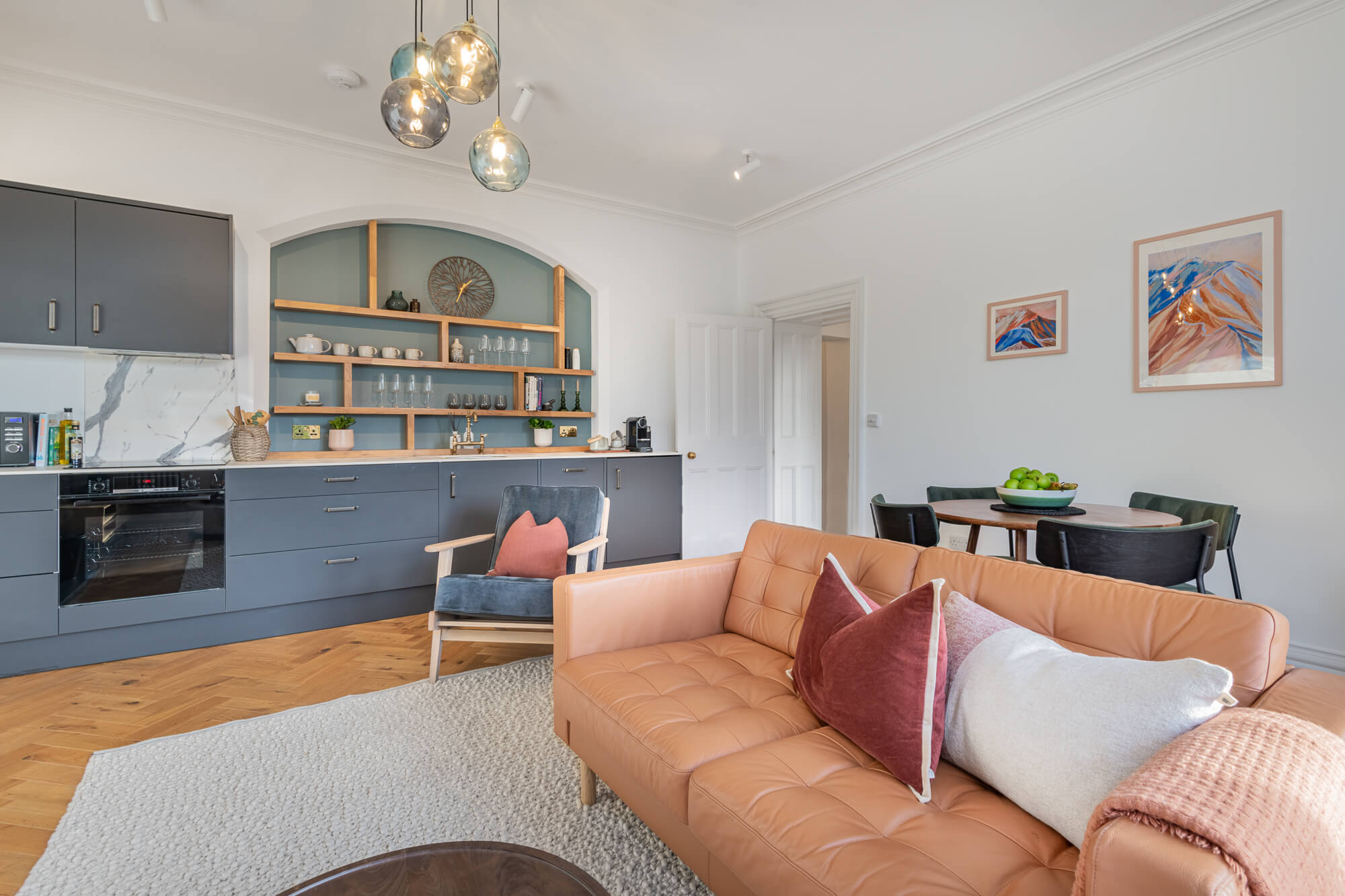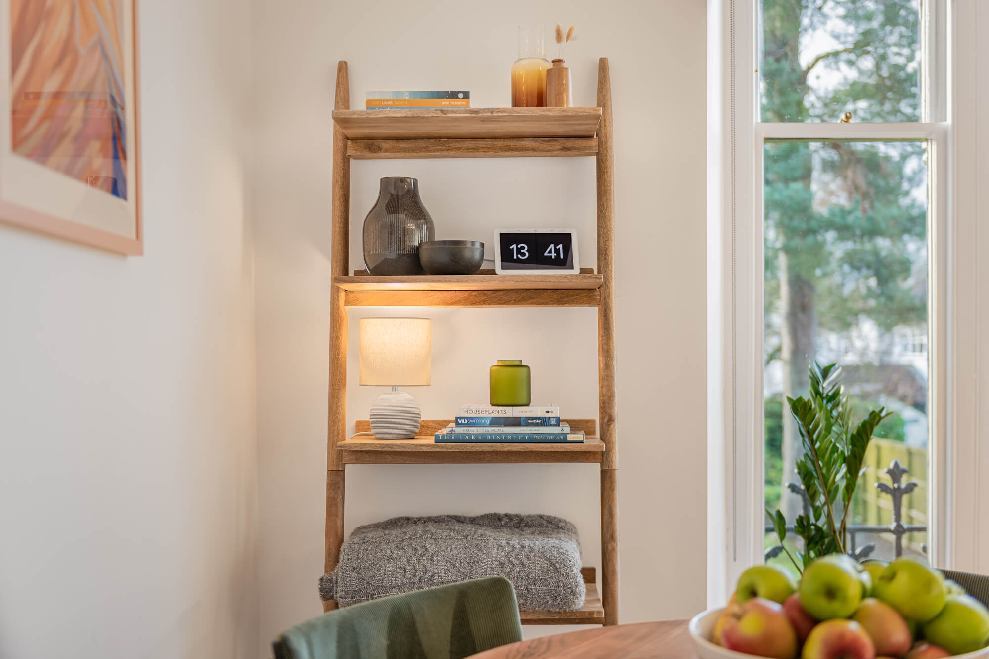 The charm of the once-gentleman’s residence greets you as you enter the private parking area; the imposing building showcases Victorian design at its best. Through the front door on the ground floor, Loughrigg is conveniently just a few steps away from the private parking area. The apartment instantly feels airy and bright as soft light drifts through the rooms from the double bay windows. Warm neutral tones envelope you, and natural fabrics bring a sense of calm and connection to the landscape beyond. Everything here has been chosen with care, creating a space that feels both refined and wonderfully relaxed.