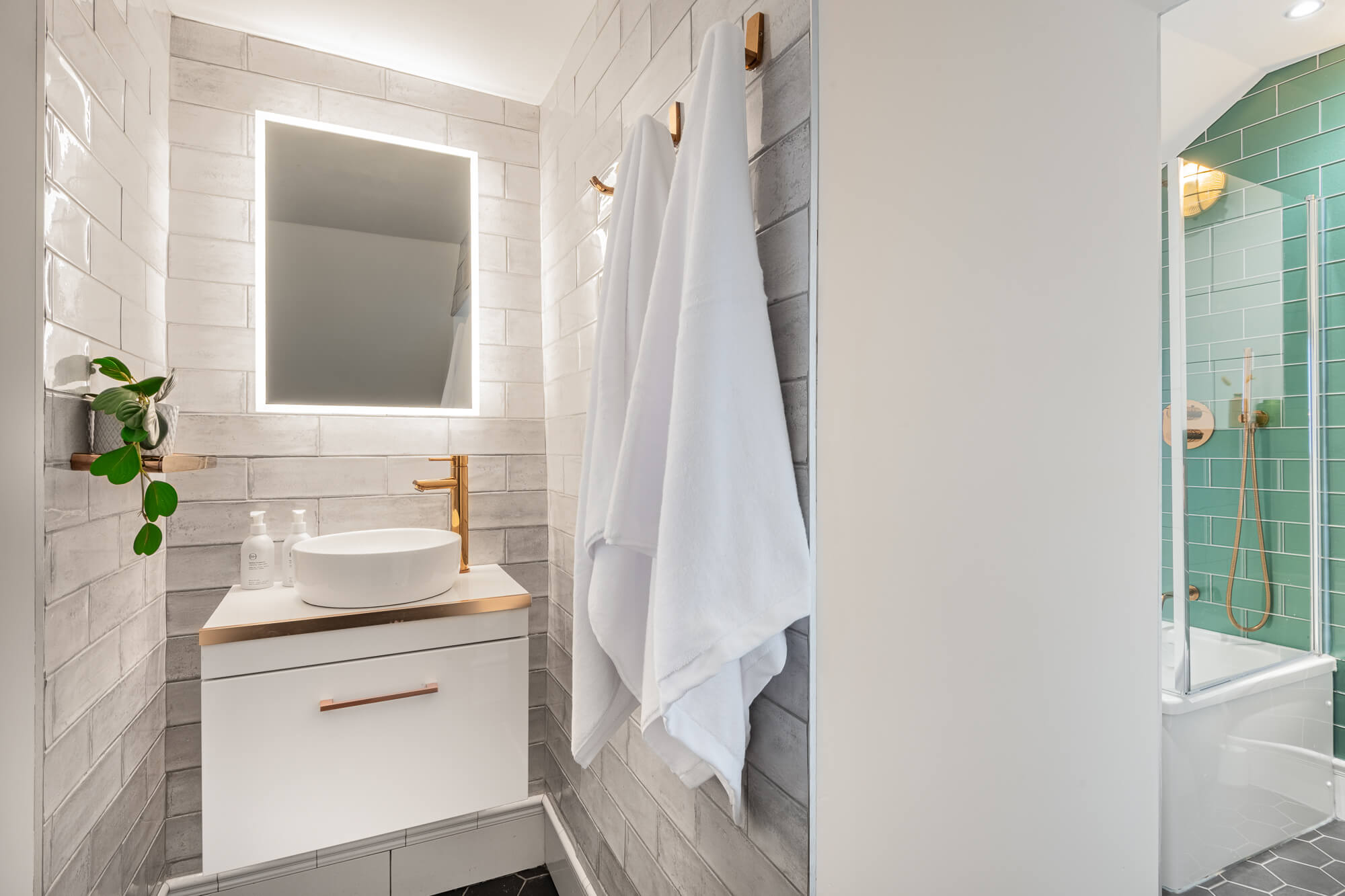 The stylish bathroom continues the apartment’s fresh, contemporary feel, offering a bright and soothing space to refresh and unwind. Why not take a long soak in the tub to soothe aching muscles after a day of Lake District adventures.