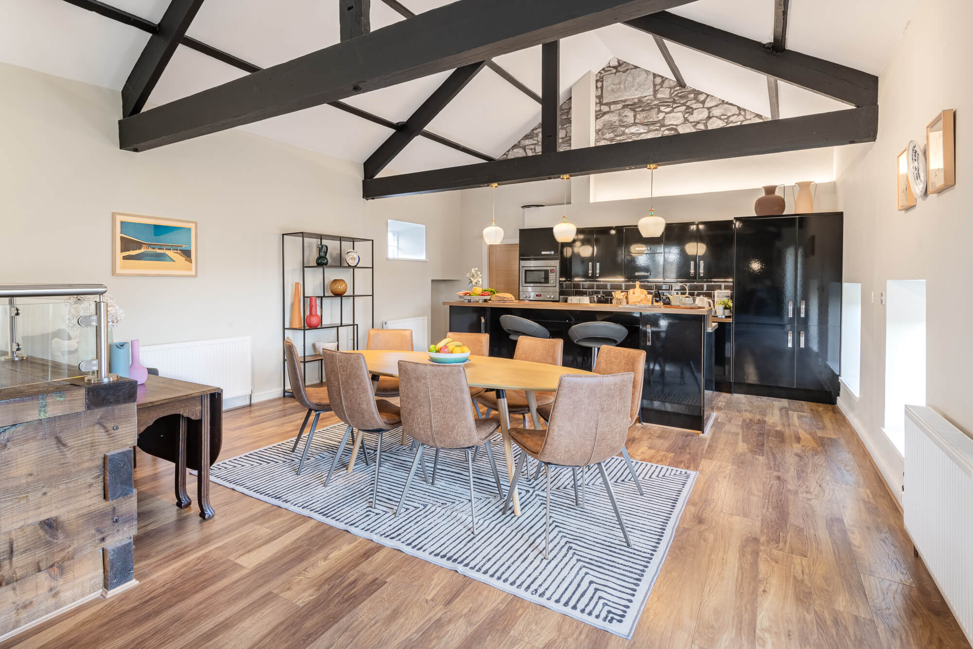 Step inside and the Barn immediately cocoons you with warmth, texture and a sense of calm. Freshly renovated with soft neutrals, natural materials and considered design details, the interior feels instantly soothing. The expansive open-plan upper floor is where life naturally gathers: an uplifting space filled with light, ideal for cooking, dining, relaxing and easing seamlessly into holiday mode.