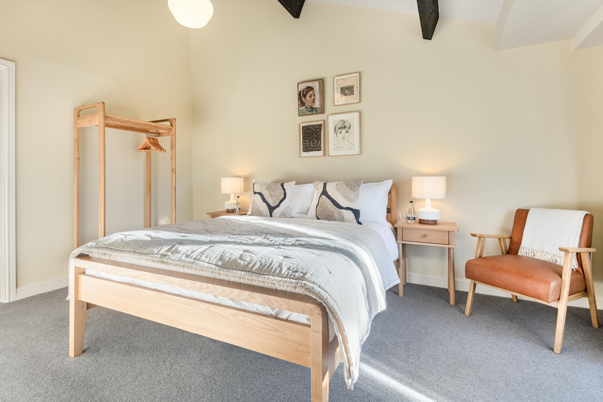 After days spent exploring the fells or wandering Cartmel’s cobbled lanes, settle on the sofa beneath exposed beams and let the log burner ease you into the evening. The dining table invites card games or relaxed chatter, while the Juliet balcony offers a perfect moment of golden light before you head out into the village for drinks, casual suppers or Michelin-starred feasts.
