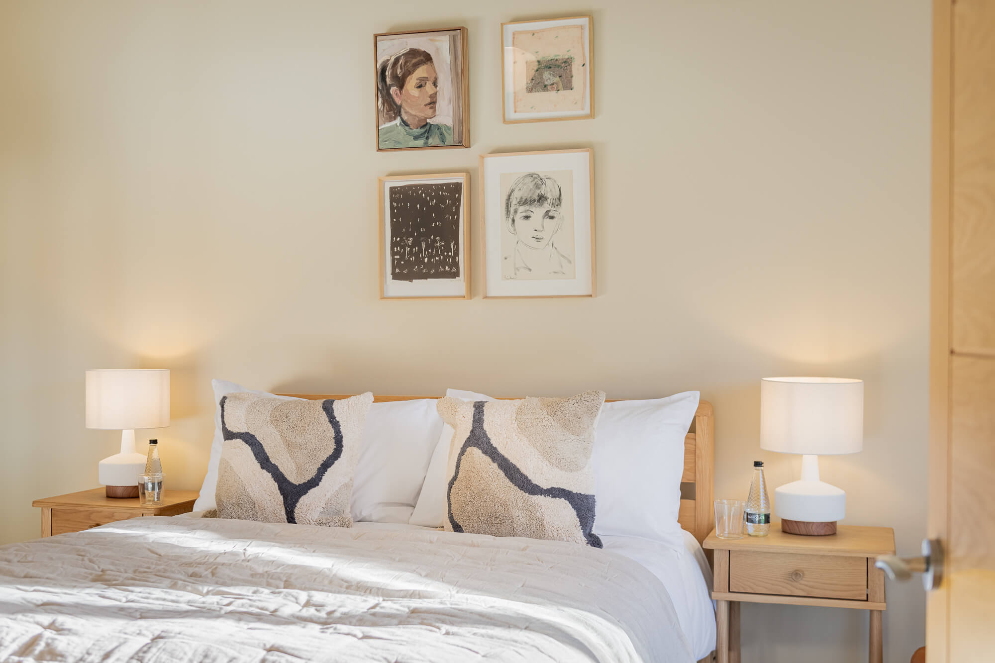 All four bedrooms rest peacefully on the ground floor, creating a calm and restful zone away from the sociable spaces above. Along the hallway, mirrored wardrobes offer generous storage, keeping everything neatly tucked away. The first double bedroom is a cocoon of soft earth tones and warm lamplight, ideal for curling up with a book or sinking into hotel-quality bedding after a day of indulgence. A private ensuite adds ease and comfort.