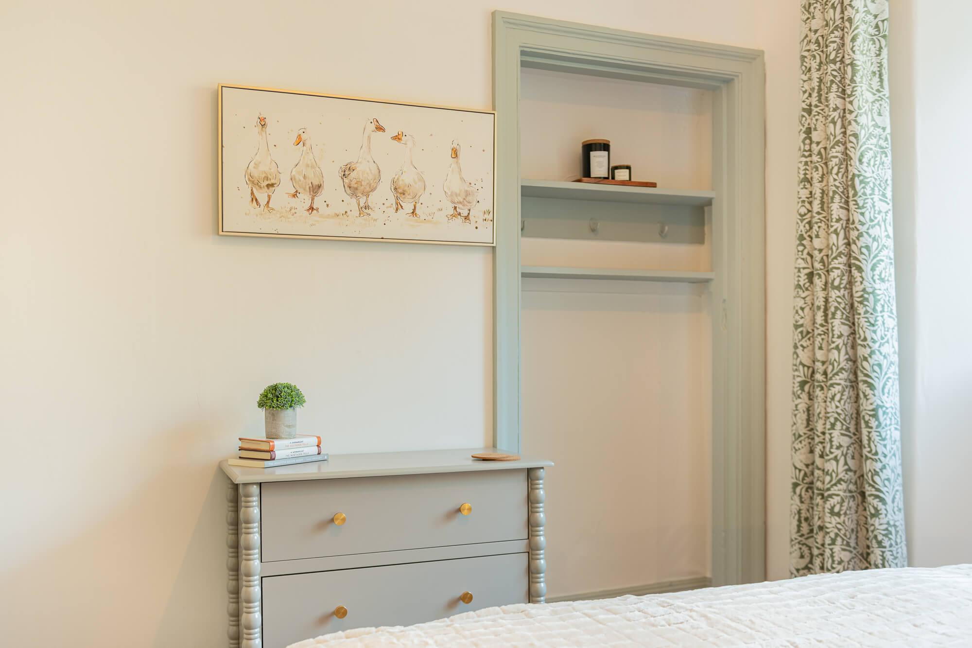 Climb the main staircase and the palette shifts to tranquil green—Little Greene’s Ambleside—complemented by period panelling and picture rails that echo the home’s Edwardian roots.