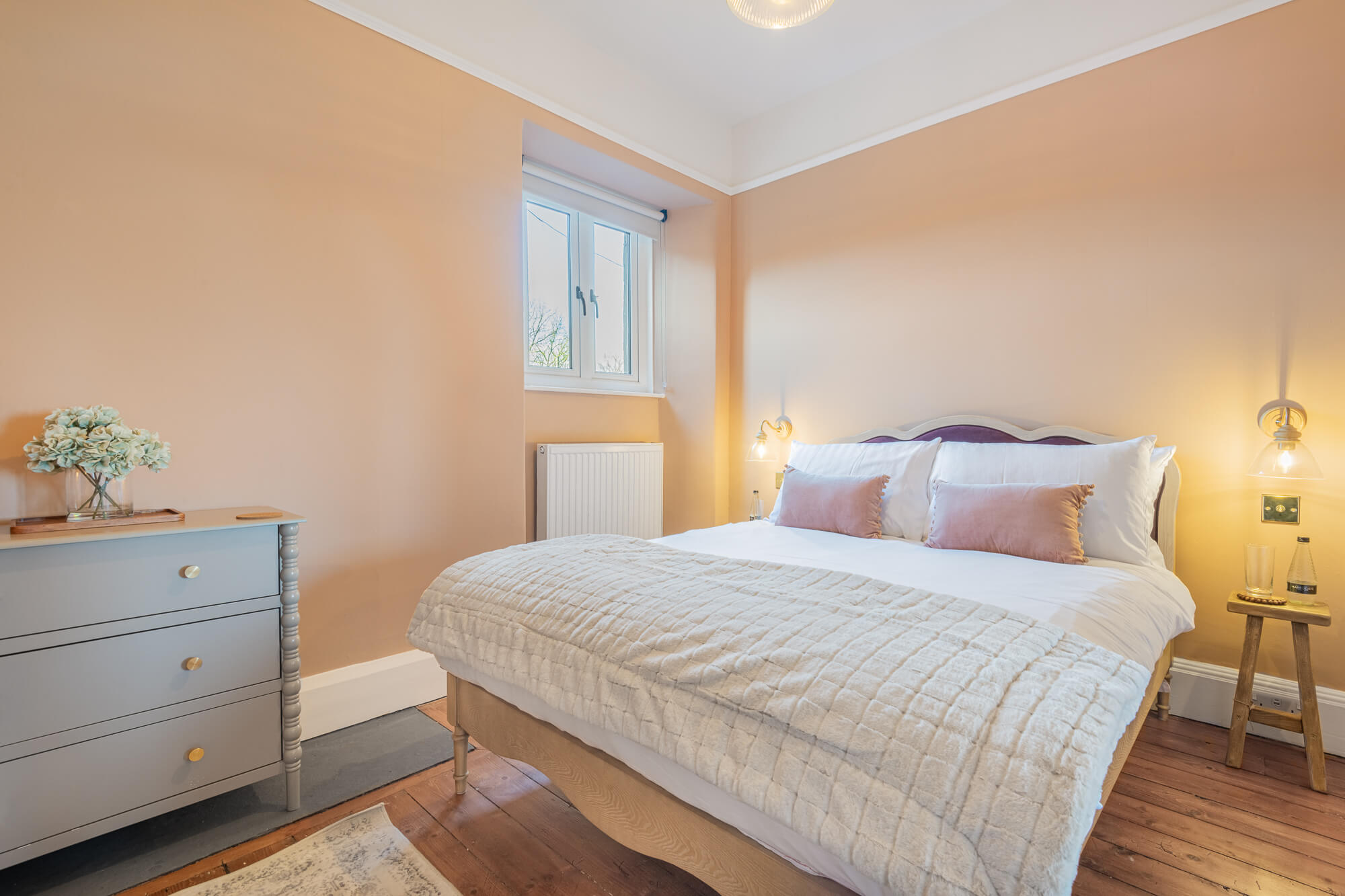 After a day exploring the farm, retreat to the first double bedroom on the left, where serene country views set the tone for deep, restorative sleep.